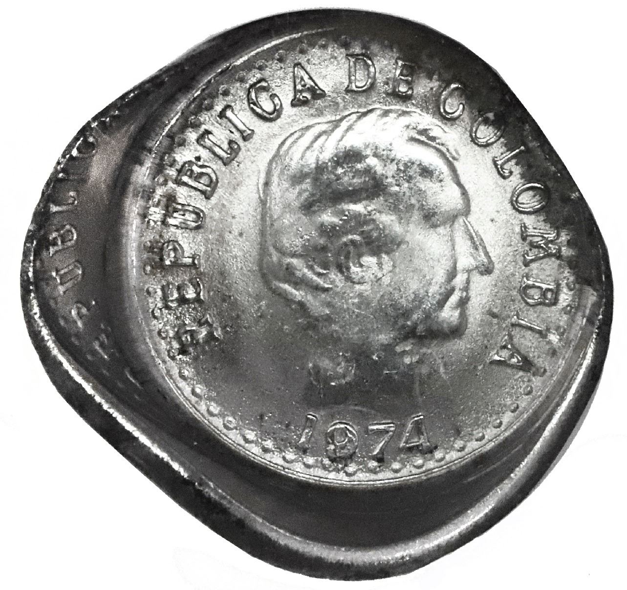 Colombia, copper-nickel 10 centavos, 1974, NGC Mint Error MS 65, obverse die cap. Restrepo-384.3; KM-253. Lustrous obverse with large area of raised extra metal around part of edge, reverse slick, the result of the coin having stuck to the die and sticking to it for multiple successive strikes, a desirable and eye-catching error. NGC #5961073-001.