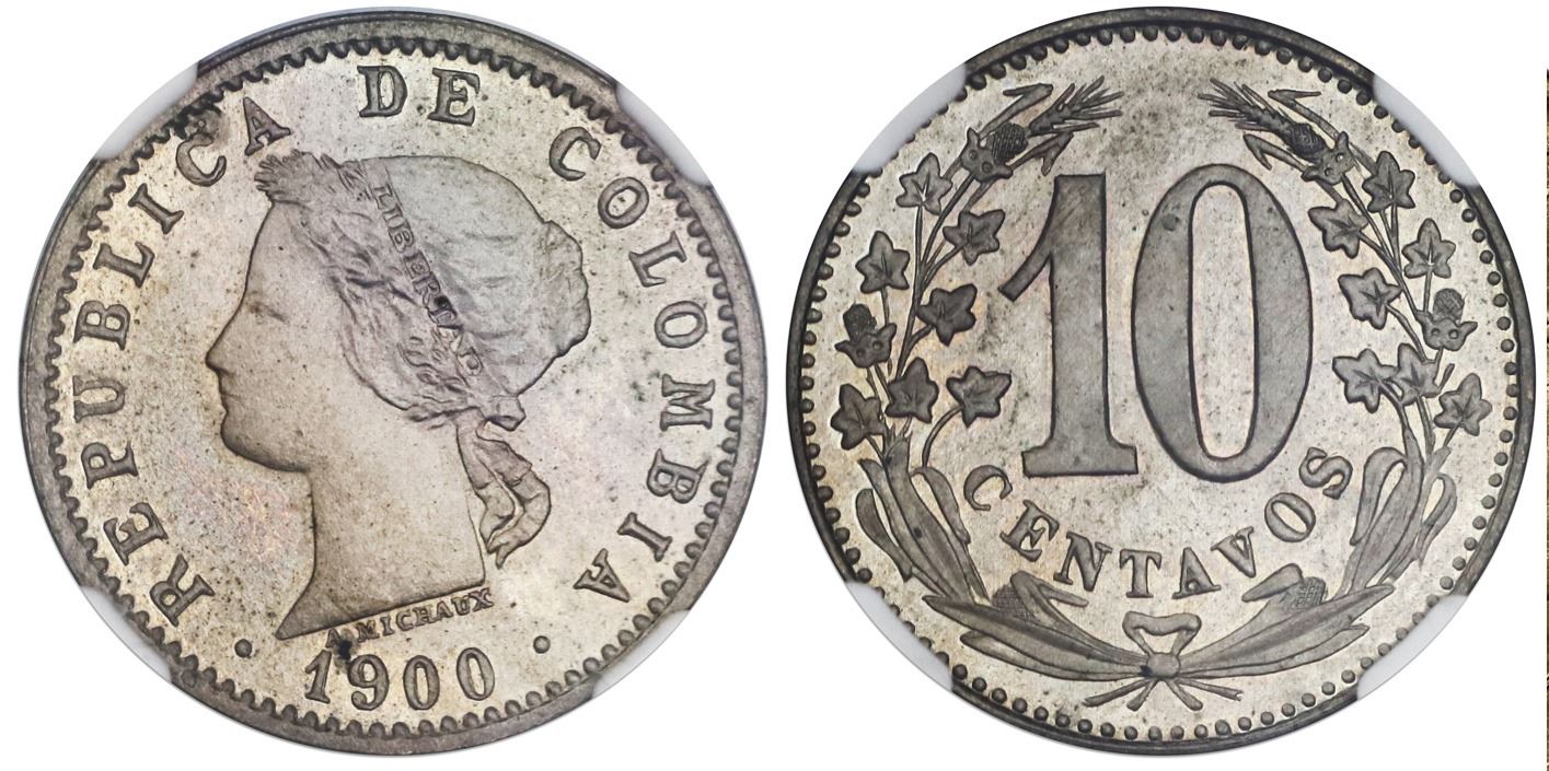 Colombia, copper-nickel pattern 10 centavos, 1900, NGC MS 63.