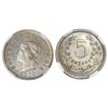 Colombia, copper-nickel proof pattern 5 centavos, 1900, NGC PF 66. Restrepo-66 (p. 254); KM-Pn76. Actually a specimen strike, with raised rims and smooth fields, no wear or marks, good luster, very light rainbow toning. NGC #2770574-001.