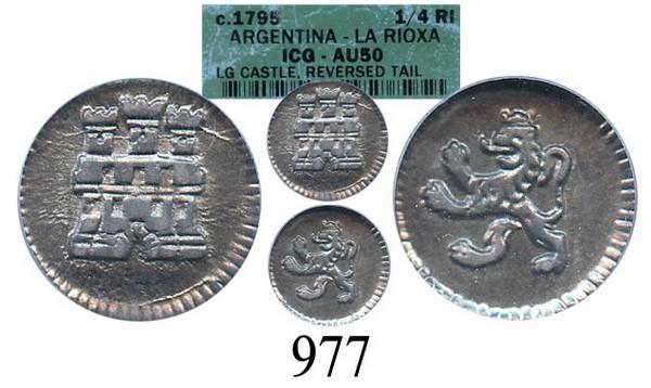 Colombia, ¼ real, Charles IV, no date or mintmark or assayer (1790-95), encapsulated ICG AU-50 (misattributed to La Rioja, Argentina). Very lustrous AU+, choice specimen of a popular issue (without any definitive marks) that has been variously attributed to Argentina and Guatemala despite best evidence for Colombia.