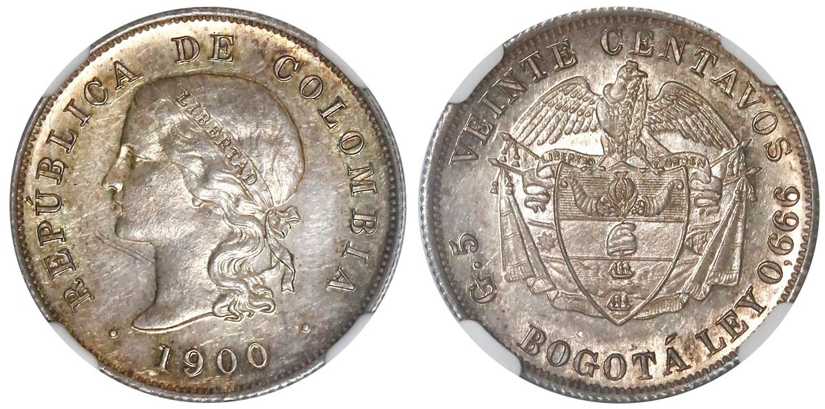 Colombia (struck at the Heaton mint, Birmingham, England), silver proof pattern 20 centavos, 1900, very rare, NGC PF 62, finest and only example in NGC census. Restrepo-78 (p. 254); KM-Pn81. Lustrous mirror fields but with raised rims and bolder details as more properly a specimen strike (therefore superior to the Eldorado example), with light golden toning, no wear but incidental marks under chin. NGC #4668518-004.