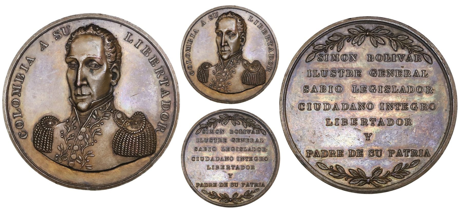 Colombia (struck in Europe), large copper medal, (1827), Bolivar, very rare. Fonrobert-unl. 40mm; 32.81 grams. Obverse with high-relief military bust of Bolivar within legend COLOMBIA A SU LIBERTADOR; reverse with SIMON BOLIVAR / ILUSTRE GENERAL / SABIO LEGISLADOR / CIUDADANO INTEGRO / LIBERTADOR / Y / PADRE DE SU PATRIA with boughs at top and bottom. Choice AU+ with traces of rainbow toning around details against an overall burnt-umber color, minimal marks. The first mention we can find of this issue is the August 27, 1859 issue of El Mosaico newspaper, which shows a drawing of the medal and says it came from Dr. Jose Manuel Restrepo "quien la obtuvo de manos del mismo Libertador" ("who obtained it from the hands of the Liberator himself"). We can trace another specimen in copper to the A. Weyl auction of April 1899 (lot #2445), and three other specimens--one copper, one silver and one white metal--appear in the Salbach collection auction of February 1911. Also this medal appears (in silver) in Plate 1.A.11 on page 41 of Ezequiel Urdaneta Braschi's Bolivar en la numismatica conmemorativa y en las condecoraciones (1983). The current confirmed population is fewer than ten in all metals (two or three of which are holed).