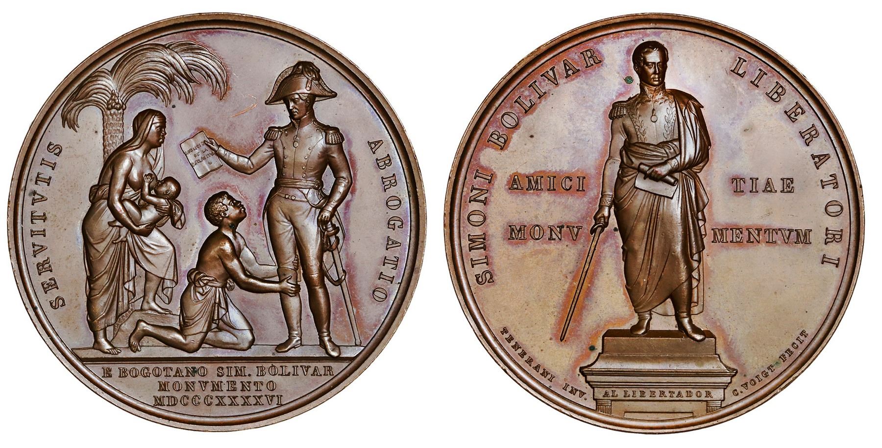 Colombia (struck in Italy), large copper medal, 1846, Bolivar / Abolition of Slavery. Fonrobert-8106. 48mm; 59.88 grams. Obverse with standing Bolivar in high relief on pedestal (showing AL LIBERTADOR) between AMICI-TIAE / MONV-MENTVM within legend SIMONI BOLIVAR LIBERATORI, signed at bottom by creator ("INV") TENERANI and maker ("FECIT") C. VOIGT; reverse with standing Bolivar at right with kneeling male slave at his feet in front of female slave holding suckling infant with legend SERVITVTIS to left and ABROGATIO to right, E BOGOTANO SIM. BOLIVAR / MONVMENTO / MDCCCXXXXVI in exergue. Attractive and important medal in choice UNC condition with rainbow toning over luster throughout, light scratch in front of Bolivar's face on reverse.
