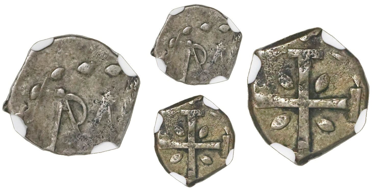 Comayagua, Honduras, provisional "imitation cob" 1/2 real, (1823), NGC XF 40, ex-Richard Stuart (stated on label). KM-unl. 1.19 grams. Nearly full cross, very off-center "PVLS" monogram (hence date off flan), oval ornaments, lightly toned. Pedigreed to the Richard Stuart collection. NGC #4494792-002.