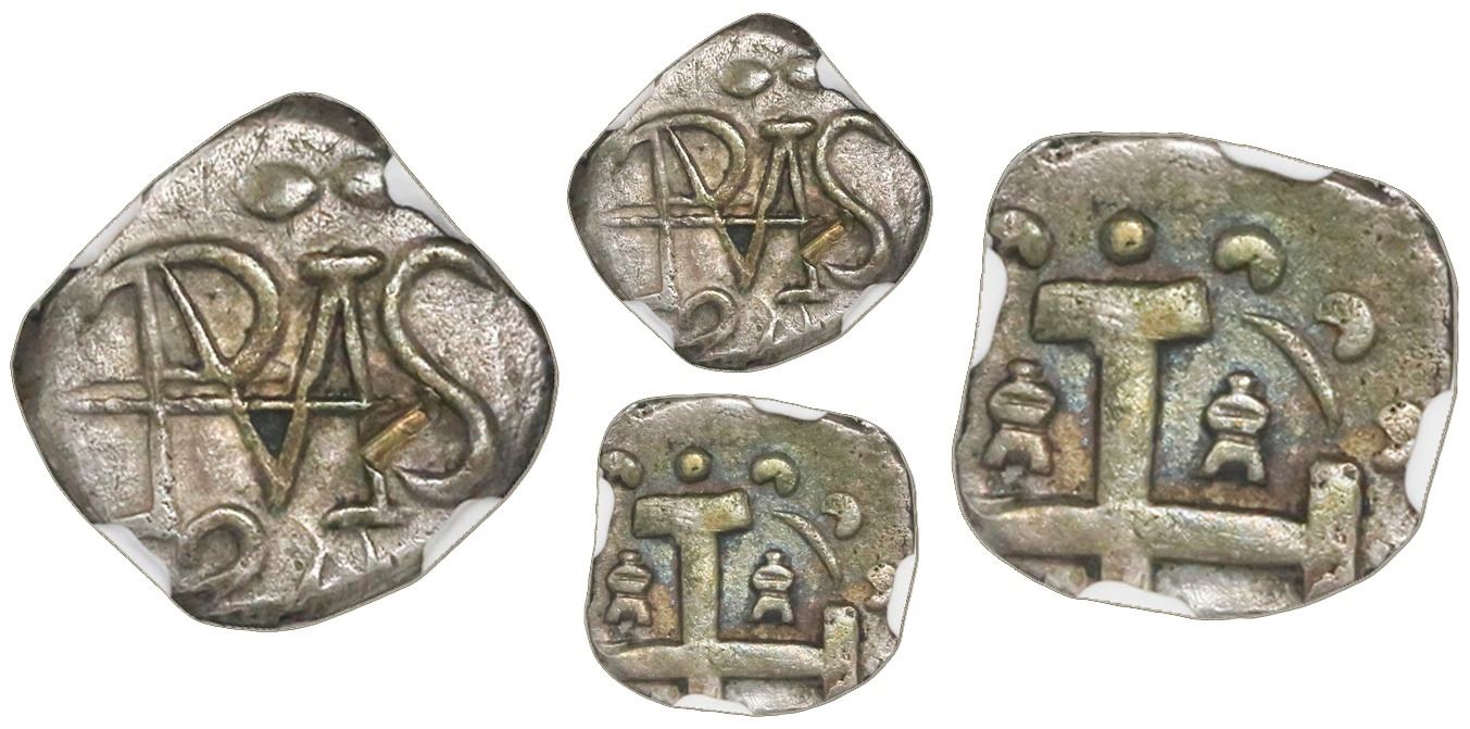 Comayagua, Honduras, provisional "imitation cob" 1/2 real, 1824, NGC AU details / damaged, ex-Richard Stuart (stated on label). KM-7.1. 1.21 grams. Choice full "PHVS" monogram with top half of date below and small dig in center, off-center cross with colorful toning, hint of muted luster. Pedigreed to the Richard Stuart collection. NGC #4494792-003.