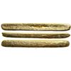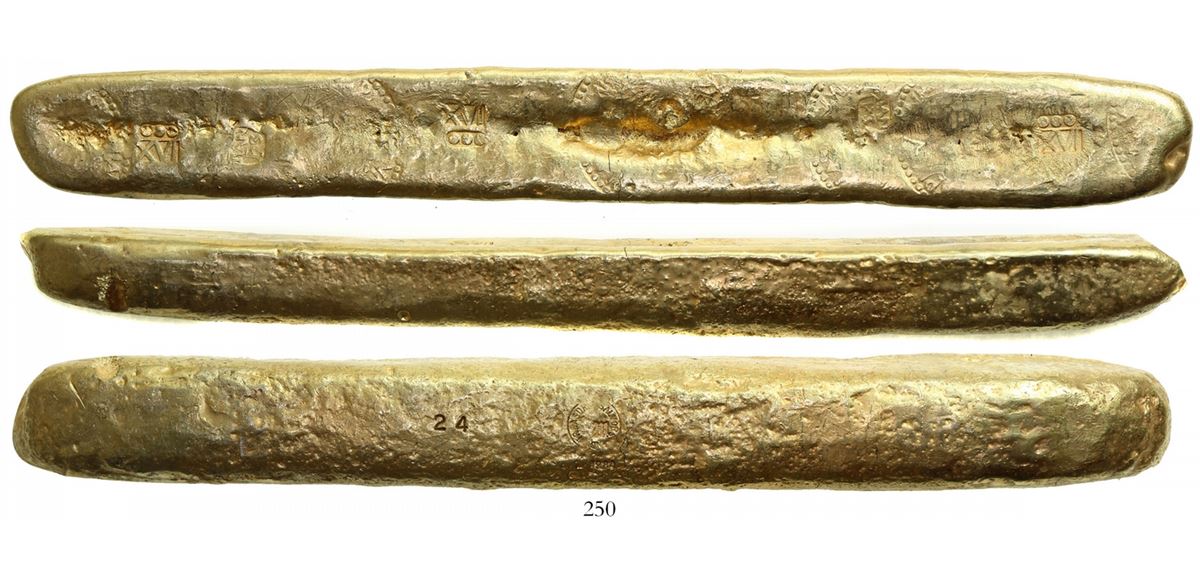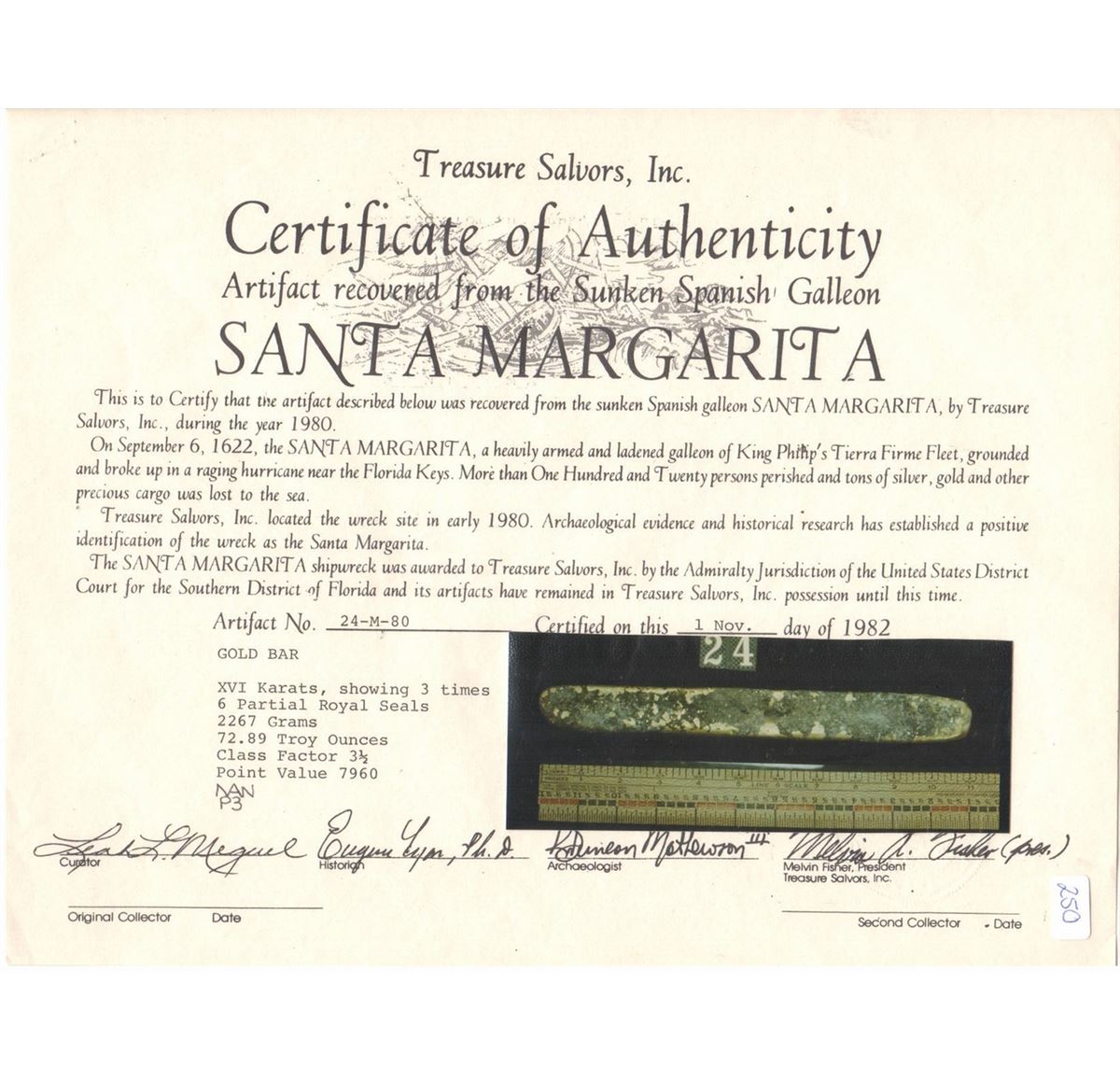 Complete gold bar #24, 2267 grams, marked with fineness XVI (16K) and foundry/assayer IVAN / P3, from the Santa Margarita (1622). 11" x 1-1/4" x 3/4". Impressively large and clean ingot with two foundry/assayer markings, three finenesses (a putative fourth fineness lost in a large natural lacuna in the center), seven circular tax stamps, small XVI and three diagonal slashes lightly inscribed into the surface (probably the assayer's temporary marking before stamping), somewhat smooth all over, with interesting (early) circular TREASURE SALVORS stamp impressed on the bottom, right next to a hairline crack (totally stable) circumscribing the center of the bar, the assayer's "bite" curiously taken near the bottom and end on one side (as opposed to a corner or top). From the Santa Margarita (1622), with Fisher photo-certificate #24-M-80.