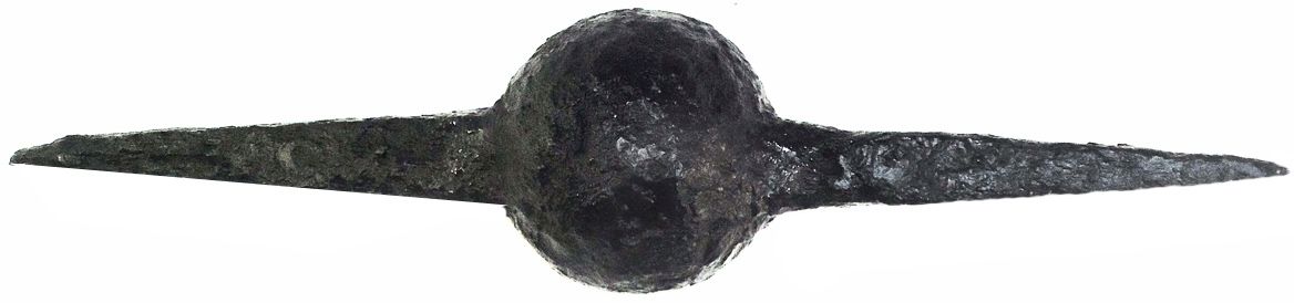 Complete iron spike-shot, very rare. 11-1/4 lb, 19" x 4-1/2". This is basically a 4" cannonball with sharp, square-shanked spikes on opposite ends to be shot out of a cannon like normal but with flaming pitch rags tied to the spikes, which set the target's sails on fire. This is the first shot of this kind we have ever offered, let alone from a major shipwreck. Recovered from: Maravillas, sunk in 1656 off Grand Bahama Island