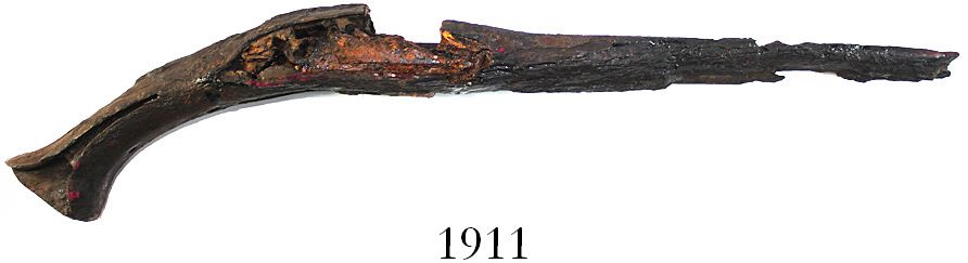 Complete stock (wood) of a flintlock pistol, very rare. 354 grams; 20" long. Flintlock pistols from shipwrecks are not unknown; but almost always they are left as coral conglomerates, as the steel parts rust away and the wood parts are eaten by teredo worms. That is why this intact wooden stock, very recognizable in shape and size and also rather hard from conservation, is so rare. Recovered from: Spanish 1715 Fleet, sunk off the east coast of Florida