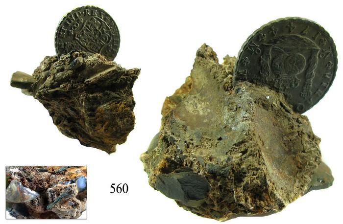 Conglomerate of one Mexican pillar dollar 1744MF and glass and other debris. KM-103. 165 grams. One of the neatest displays we have ever seen, with a choice and fully detailed pillar dollar (scarcer date) clinging by its edge to a large hunk of "sea rock" containing at least a half a dozen pieces of broken glass of different colors (white, green and blue), a small, round, bronze object that could be a crotal bell, and the hollow remains of a long piece of iron or wood. Recovered from: Reijgersdaal, sunk in 1747 off South Africa.