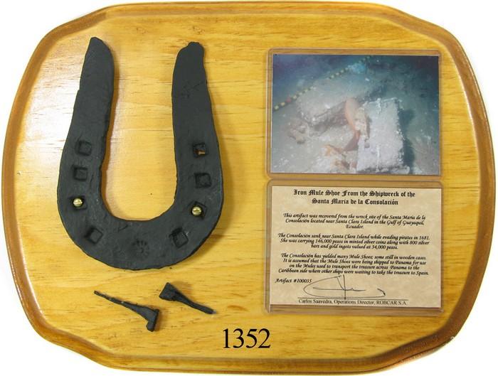 Conserved iron mule shoe and nails mounted on wooden display plaque. 659 grams, 11¾" x 8¾" x 1". A well-preserved (coated black) mule shoe with two corroded nails mounted with a small certificate and an in-situ photo of the chest that yielded the shoes onto a rectangular plaque with beveled edges and rounded corners, an attractive display guaranteed to bring good luck. Recovered from: Consolación, sunk in 1681 off Santa Clara Island, Ecuador. With ROBCAR photo-certificate #I00035.