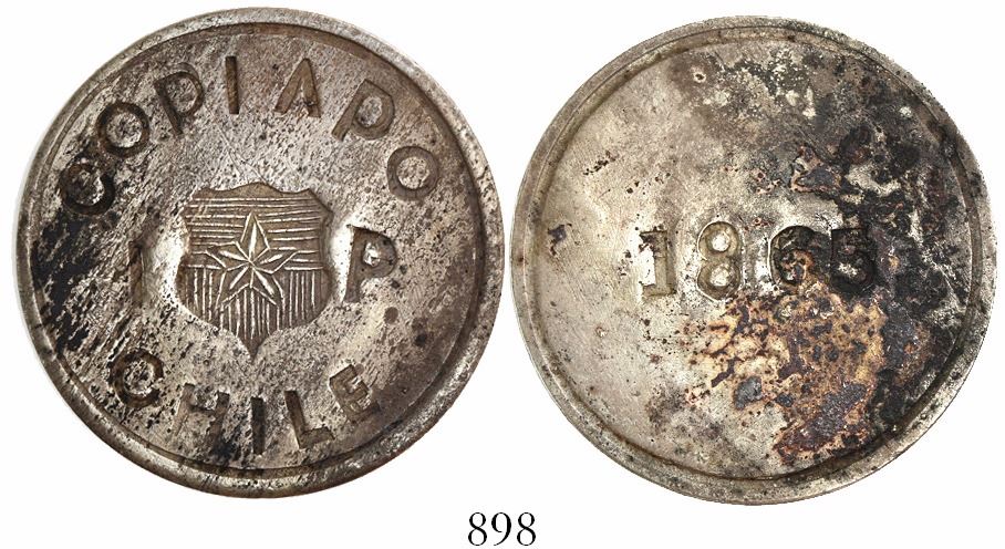 Copiapo, Chile, 1 peso, 1865. KM-4. 19.05 grams. Interesting siege coinage issued for the blockade of Puerto de Caldera during the war with Spain, incuse design, probably XF details but with light surface porosity and scratches on obverse and large patch of oxidation / encrustation on reverse.