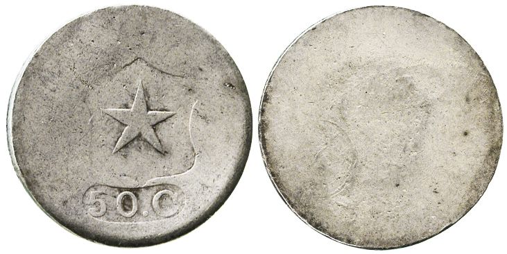 Copiapo, Chile, 50 centavos, (1859), flat star, wide shield. KM-1.4. 11.3 grams. Scarce uniface issue with star in shield above denomination (underpriced in KM), somewhat lightly struck but also somewhat worn, Fine with light toning, no problems.