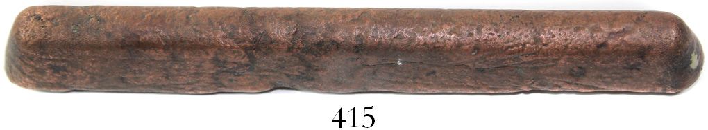 Copper "finger" bar, 416 grams, from the Hindostan (1803), rare provenance. 6-1/2" x 3/8" x 7/8". A neatly cast "cigar" of copper (classic form, with flat top and rounded bottom and sides), no markings but important as the first of its kind we have offered from this wreck, minor corrosion and patches of bright green. From the Hindostan (1803), with original certificate from the salvager.