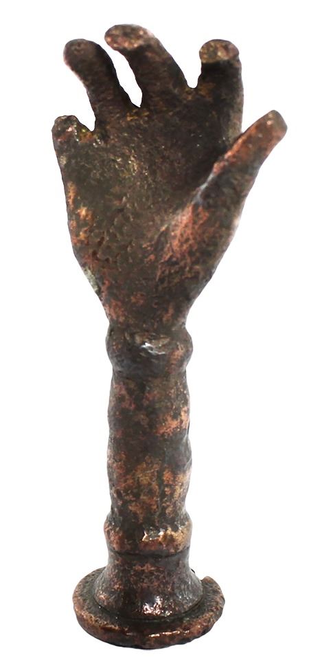 Copper pipe tamper in the shape of a hand, ex-Colossus (1798). 19 grams, 2" x 3/4". Fascinating relic which stands upright on a cross-hatched flat bottom, some fingers of holder missing or broken off, but certainly recognizable as a miniature hand. From the Colossus (1798), with original box and photo-certificate from the salvagers.