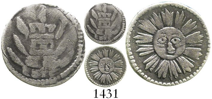 Cordoba, Argentina, 1/4 real, 1833 (inverted 33), extremely rare (3 known). Janson-2.2.1.; KM-1.1. 0.7 gram. Crude Fine with bold sunface. Note: This is THE specimen noted in Janson as "Coleccion particular - Buenos Aires".