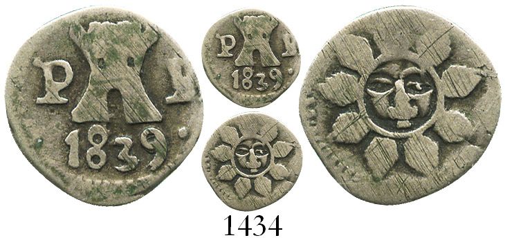 Cordoba, Argentina, 1/4 real, 1839P-P, Type II. Janson-6.1.30 (variant), KM-2.2.; KM-2.2. 0.8 gram. Bold details with contrasting toning, Fine or so.