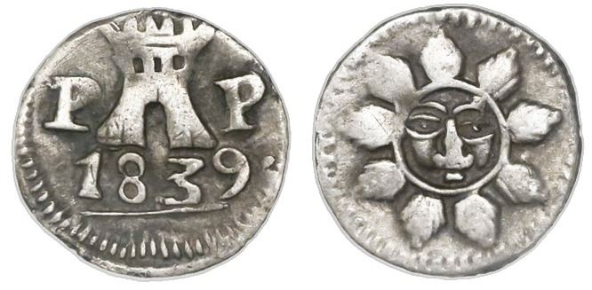 Cordoba, Argentina, 1/4 real, 1839PP, rare die variety (line below date). Janson-6.2.2. 0.80 gram. Bold, well-toned VF, the castle side slightly off-center, nice example of a rare variety.