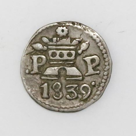 Cordoba, Argentina, 1/4 real, 1839PP. Janson-11.2.1; KM-2.2. 0.84 gram. XF, bold design elements, some light sediment in fields, rims crude (as made).