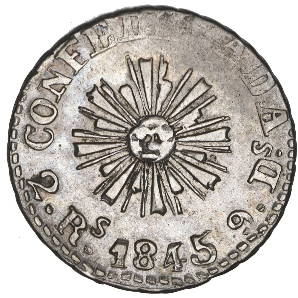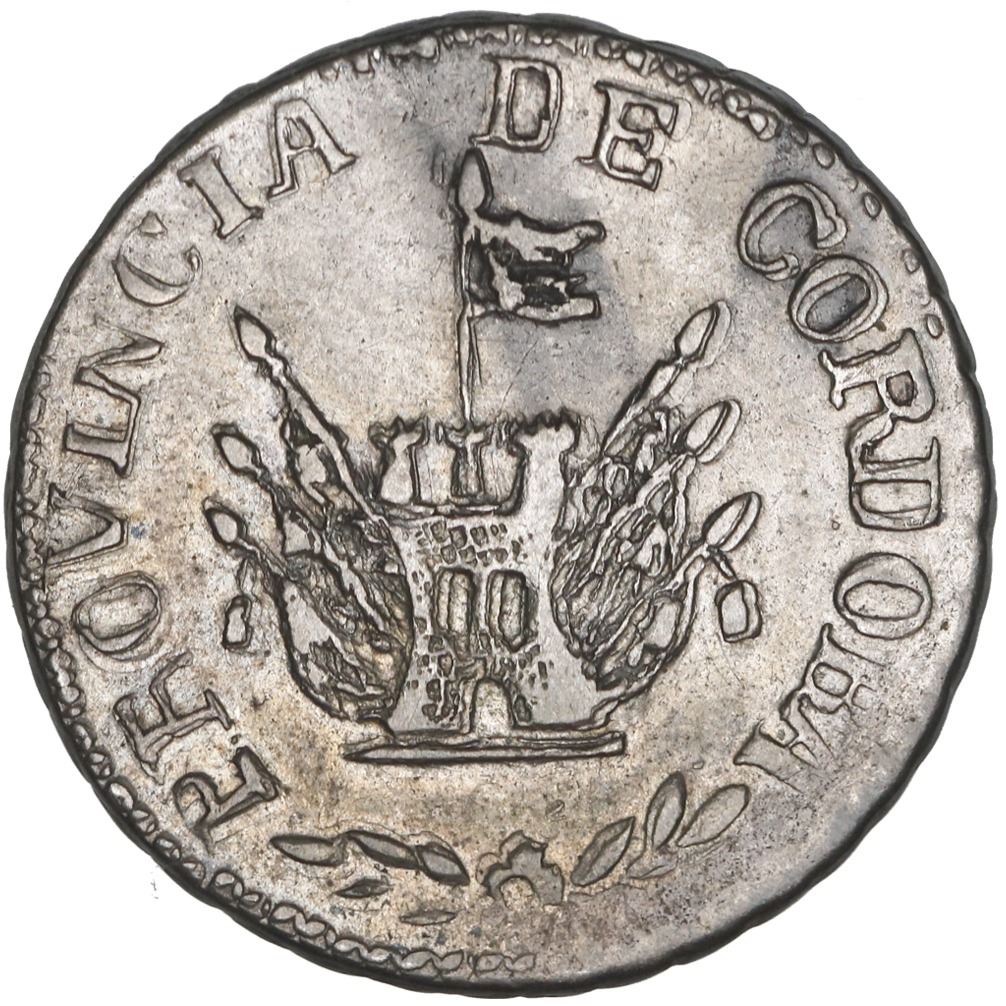 Cordoba, Argentina, 2 reales, 1845 2.Rs. 9.Ds, flag right, NGC XF details / cleaned, ex-Carter, ex-O'Brien. Janson-51.3.4; KM-23. 6.43 grams. Lightly toned XF with a spot of strike weakness at 1 o'clock. NGC #5934389-017. Pedigreed to the Amon Carter collection (Coin Galleries auction of November 1994) and the John O'Brien collection (stated on label).