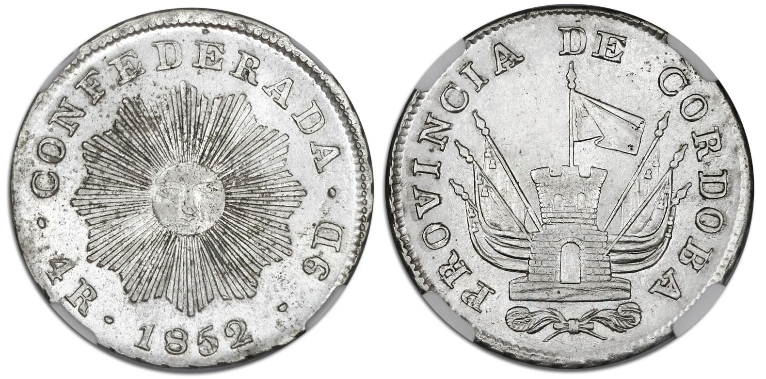 Cordoba, Argentina, 4 reales, 1852, Rioja-style rays around sun, NGC MS 64.