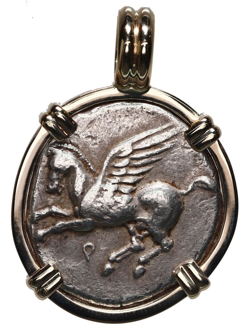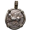 Corinth, Corinthia, AR stater, "pegasus," ca. 347-307 BC, mounted pegasus-side out in heavy 14K gold bezel with fixed bail. 12.19 grams total. Pegasus flying left / Helmeted head of Athena right. Well centered VF pegasus with slight sedimentation in crevices adding to its appeal, mounted in a plain custom setting.