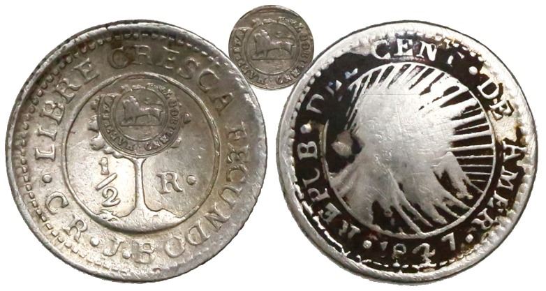 Costa Rica, 1/2 real, "lion" countermark (Type VI, 1849-57) on a Costa Rica (Central American Republic) 1/2 real 1847JB, "CRESCA" variety (rare). KM-68. 1.43 grams. Host coin with the outdated spelling CRESCA discontinued late the year prior; the backside die was left over from that earlier era. Incomplete (along top band) XF countermark, heavy sedimentation and light scratches on reverse of Fine host.