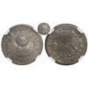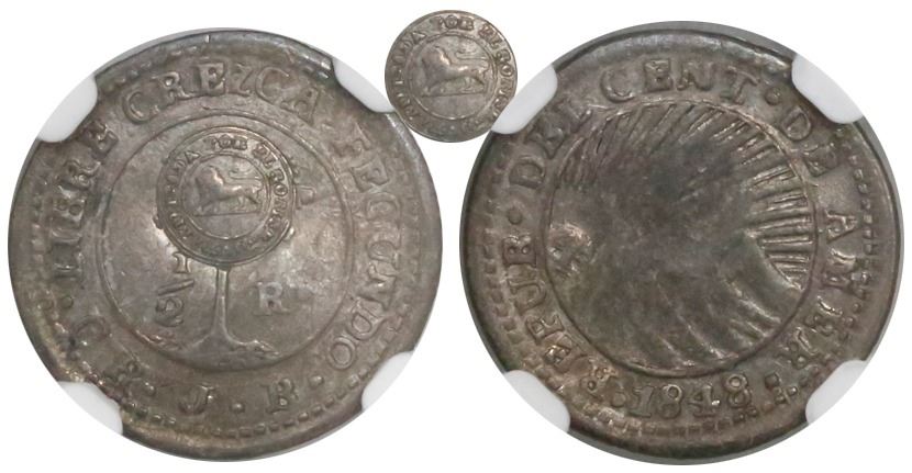 Costa Rica, 1/2 real, "lion" countermark (Type VI, 1849-57) on a Costa Rica (Central American Republic) 1/2 real of 1848JB, encapsulated NGC XF45. KM-67. 1.5 grams. Deeply impressed but incomplete countermark, host nice About Fine with rosy red toning.