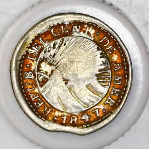 Costa Rica, 1/2 real, "lion" countermark (Type VI, 1849-57) on a Costa Rica (Central American Republic) 1/2 real 1847JB, NGC XF 45, c/s XF standard. KM-68. 1.50 grams. Decent countermark with a little weakness along top legend, flat host with deeply toned fields yet silvery rims and centers (possibly from being hammered flat during countermarking). NGC #4703624-006.