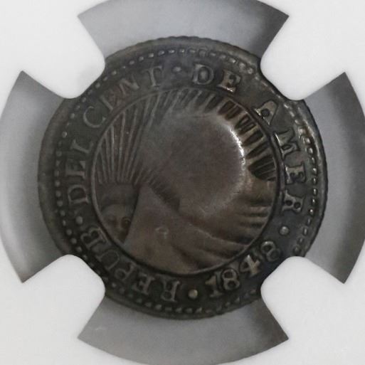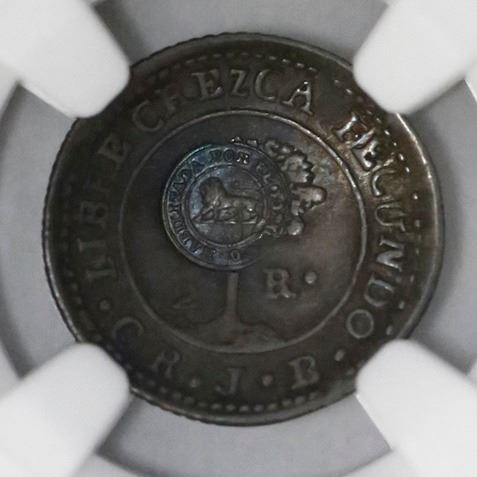 Costa Rica, 1/2 real, "lion" countermark (Type VI, 1849-57) on a Costa Rica (Central American Republic) 1/2 real 1848JB, NGC XF 40, c/s XF standard. KM-68. 1.44 grams. Almost full countermark with strong definition on cupped host, attractive deep rainbow toning. NGC #4703624-008.