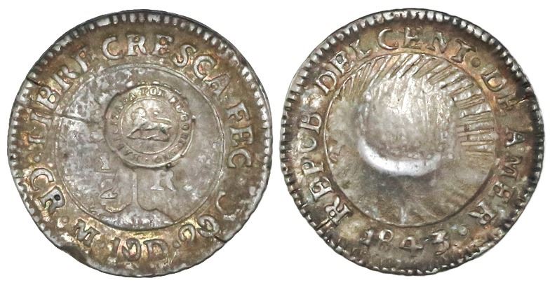 Costa Rica, 1/2 real, "lion" countermark (Type VI, 1849-57) on a Costa Rica (Central American Republic) 1/2 real 1843M. KM-67. 1.49 grams. XF host and complete countermark (not as concave as most, but with crude area in sunrays opposite the countermark), colorfully toned, parts of rims crude (as made).