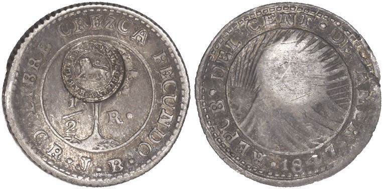 Costa Rica, 1/2 real  lion  countermark (Type VI, 1849-57) on a Costa Rica (Central American Republi