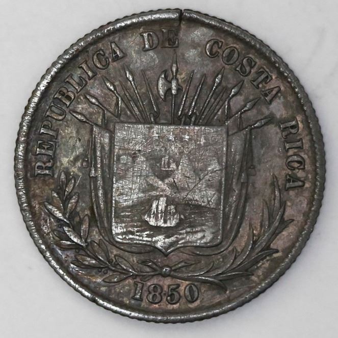 Costa Rica, 1/4 peso, 1850JB. KM-103. 6.03 grams. VF+ with small split in planchet, old scratches now deeply toned over.