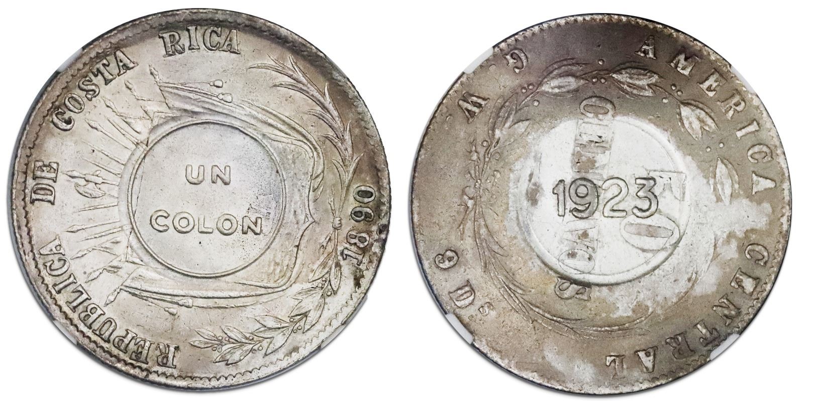 Costa Rica, 1 colon, 1923 counterstamp (Type IX) on a Costa Rica 50 centavos 1890GW, NGC MS 64, c/s UNC standard. KM-163. Bold counterstamp with satin-smooth fields, the host coin with minor marks and rim-flaws (as made) with very light reddish toning, finest known by six grades at NGC census (but only for those specifically attributed to this host date, "top pop" for this type being MS 65). NGC #4738959-015.