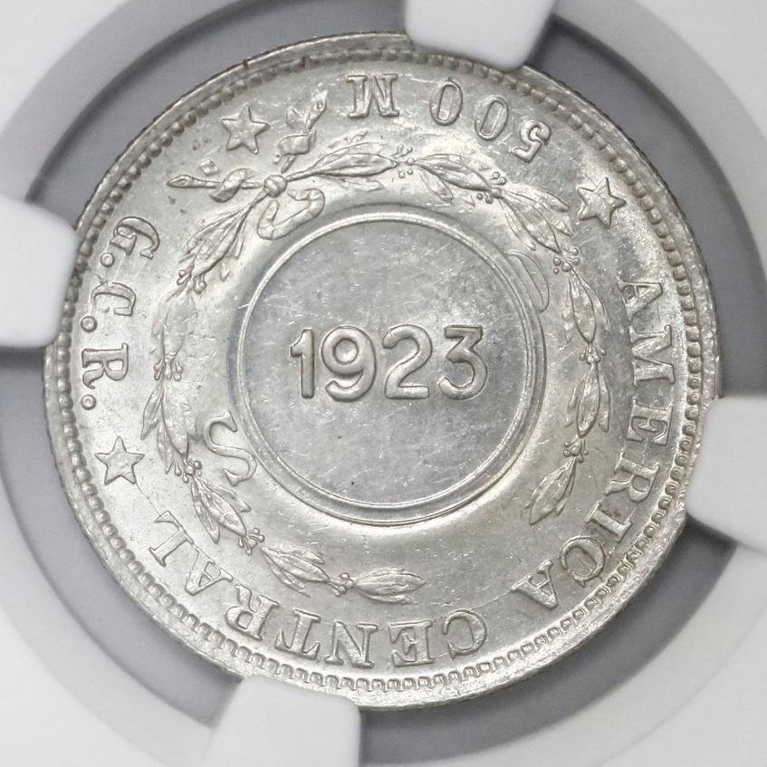 Costa Rica, 1 colon, 1923 counterstamp (Type VIII) on a Costa Rica 50 centimos 1917M, NGC MS 62, c/s UNC standard. KM-165. 9.90 grams. Of the 9,400 mintage for the 1917M 50 centimos, 9,390 were countermarked with the 1923 1 colon redenomination. Lustrous, a few surface hairlines to note, faint gold toned. NGC #4703634-005.