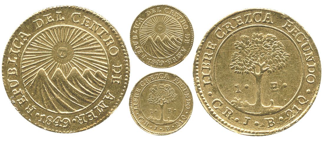 Costa Rica, 1 escudo, 1849JB. KM-14. 3.1 grams. Well-detailed XF (nice strike) with hairlines and the edge re-applied as from a jewelry mounting.