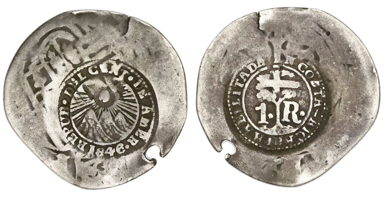 Costa Rica, 1 real, 1846JB counterstamp (Type IV) on a Mexico City, Mexico, cob 1 real of Philip II.