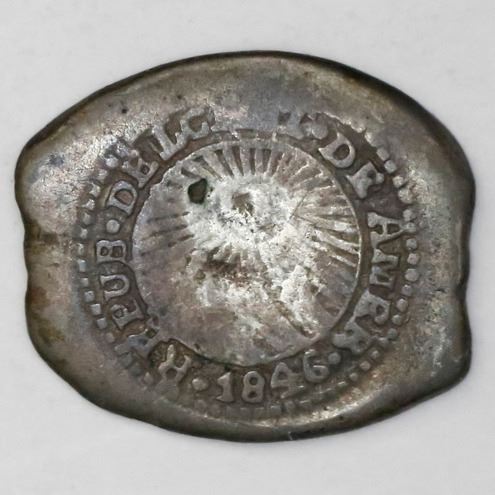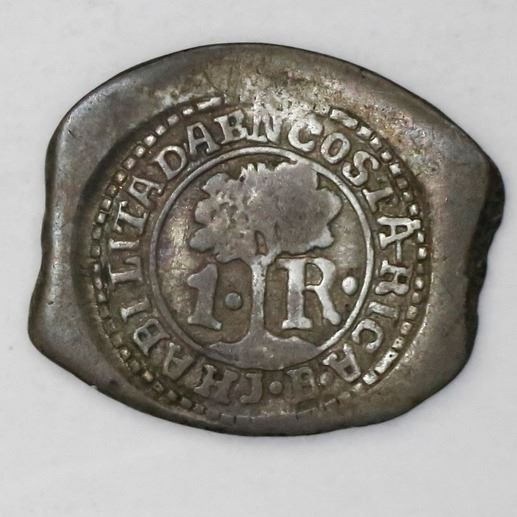 Costa Rica, 1 real, 1846JB counterstamp (Type IV) on a Potosi, Bolivia, cob 1 real of the mid-1700s.