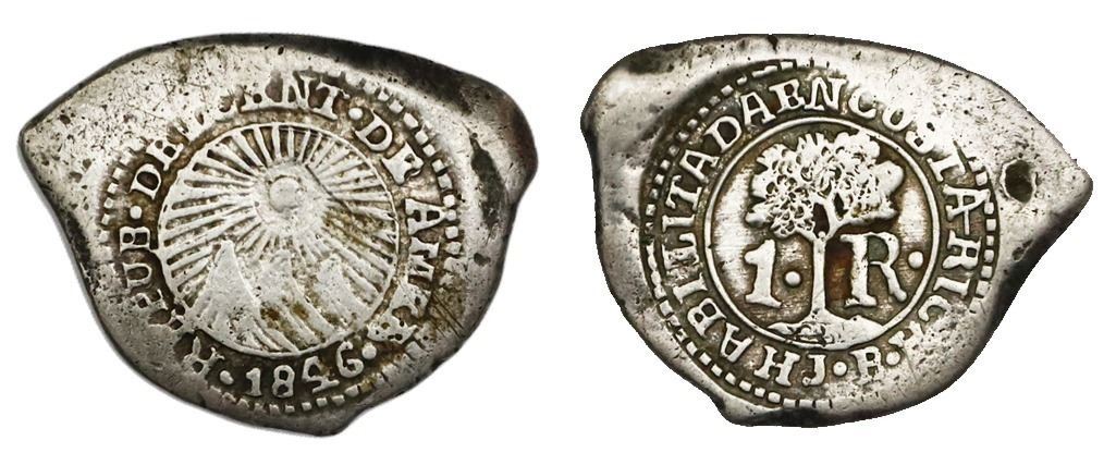 Costa Rica, 1 real, 1846JB counterstamp (Type IV) on a Potosi, Bolivia, cob 1 real of the mid-1700s.