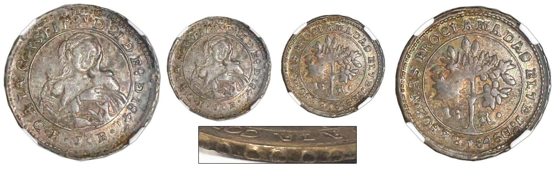 Costa Rica, 1 real, 1847JB, normal B, colonial-style edge (very rare), "Madonna and child" proclamation issue, NGC AU 53. KM-unl (65 for Type). Deep colorful toning, typically soft strike without problems, choice grade, one of just three with normal B at NGC (just one higher at AU 58) but the rarer aspect of colonial-style edge (circles and dots) is not noted by NGC (so the graded population is unknown) nor by KM. Specialists will recognize it as the rarest of the 1847 varieties. NGC #4700529-008.