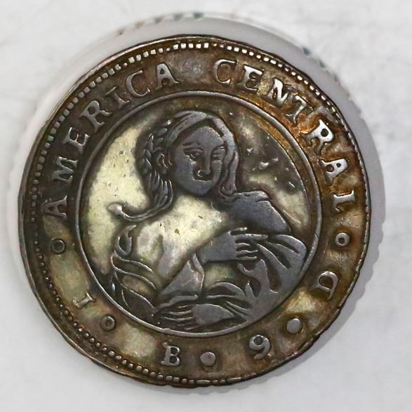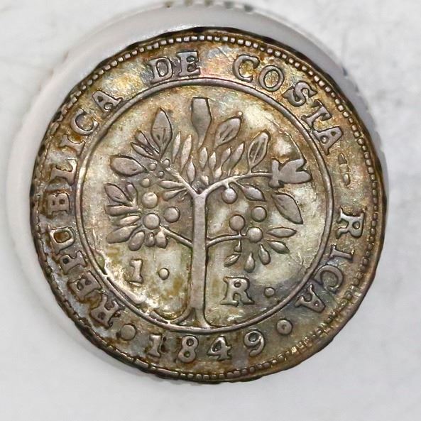 Costa Rica, 1 real, 1849JB, "Madonna and child" issue, NGC VF details / cleaned. KM-66. 2.83 grams. Popular Costa Rican type coin. Odd color from debased silver (0.750 fineness) with gold toned fields and dark raised areas. NGC #4703624-014.