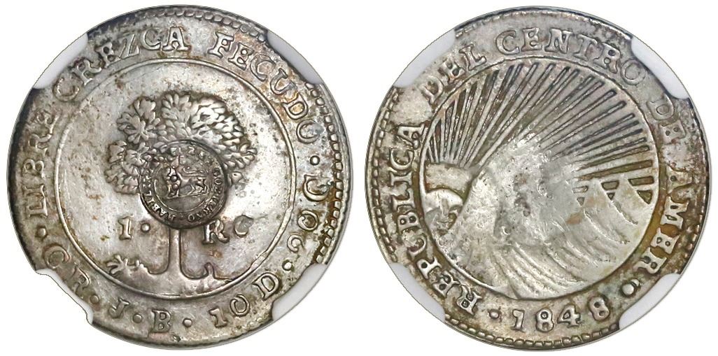 Costa Rica, 1 real, "lion" countermark (Type VI, 1849-57) on a Costa Rica (Central American Republic) 1 real of 1848JB with "FECUDO" error, NGC XF details / tooled. KM-72. 2.95 grams. Bold XF countermark in very center, the stated tooling apparently a flattening of the consequent distortion on the other side, interesting error with FECUDO instead of FECUNDO in legend, light toning around details. NGC #4703624-012.