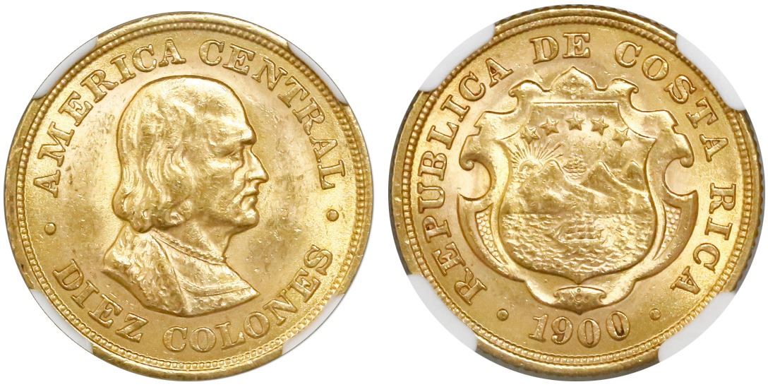 Costa Rica, 10 colones, 1900, NGC MS 64, ex-Richard Stuart (stated on label). KM-140. Bold and lustrous, with minor bagmarks, tied with two others for second finest in NGC census behind a single MS 65. Pedigreed to the Richard Stuart Collection. NGC #4425835-013.