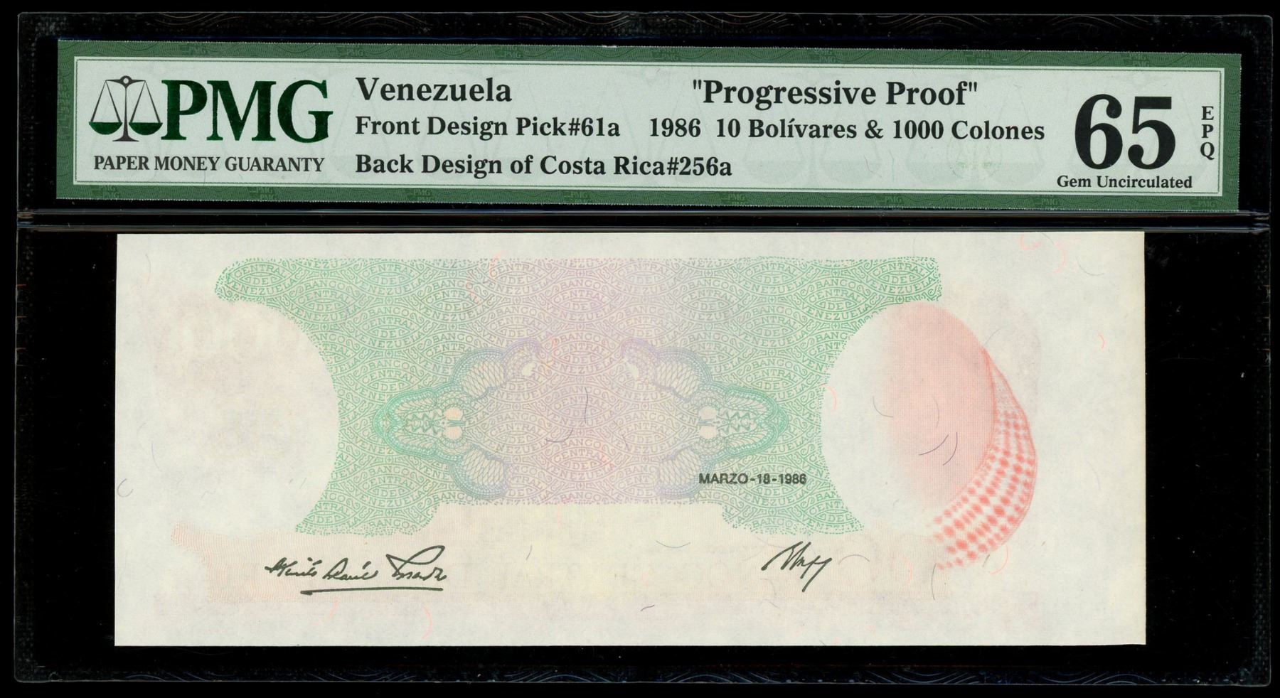 Costa Rica, 1000 colones reverse paired with a Venezuela, Banco Central, 10 bolivares progress proof dated 18-3-1986, PMG Gem UNC 65 EPQ. SCWPM-256a (Costa Rica), 61a (Venezuela). Fascinating printer's scrap or test piece with two different country's bank note designs combined into one note! Colorful design (for both countries) with excellent paper quality.