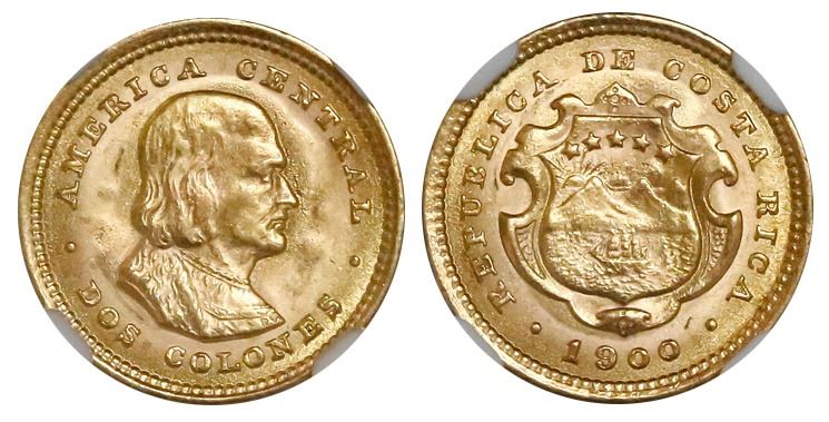 Costa Rica, 2 colones, 1900, NGC MS 65, ex-Richard Stuart (stated on label).