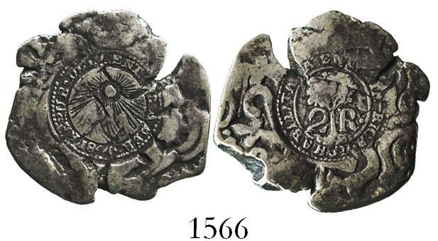 Costa Rica, 2 reales, 1846 counterstamp (Type V) on a Potosi, Bolivia, cob 2 reales of Philip V assayer M. KM-54. 5.5 grams. Full and well-detailed counterstamp (VF), with much undercoin detail (VG), just not the date, with edge-splits but nicely toned.