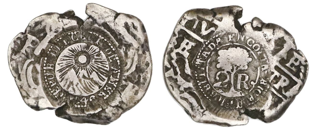 Costa Rica, 2 reales, 1846JB counterstamp (Type V) on a Potosi, Bolivia, cob 2 reales of assayer E (