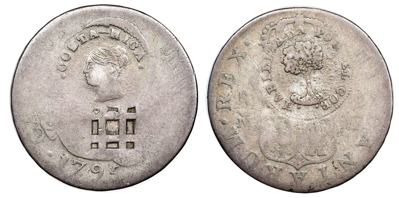 Costa Rica, 2 reales, Liberty head / ceiba tree double countermark (Type III, 1845) on a Cuba (Trinidad / Santiago / Principe) 2 reales lattice countermark (1841) on a Madrid, Spain, bust 2 reales, Charles IV, 1795MF, NGC Fair 2, c/s VF standard, ex-Raymond. KM-37. Mostly bold countermarks (including the lattice) on worn but deeply toned host with clear date and mintmark. NGC #5846759-009. Pedigreed to the Wayte Raymond collection (NASCA auction of December 1977, with original lot-tag 988 plus collectors tag).