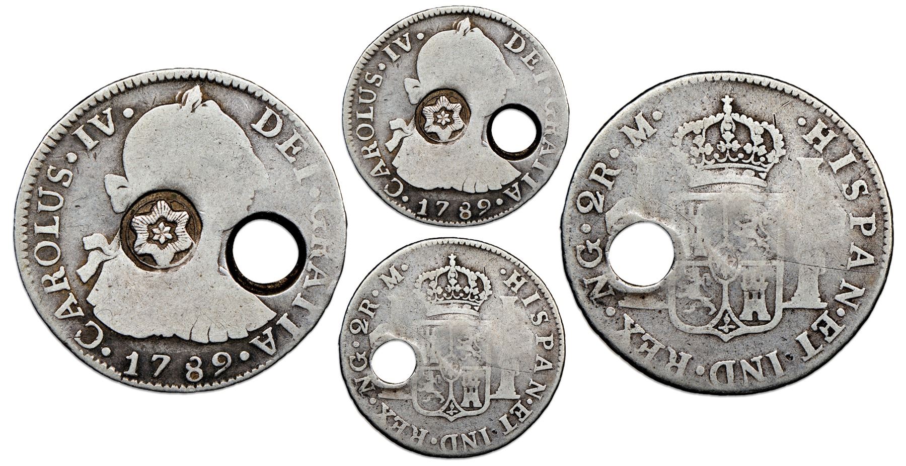 Costa Rica, 2 reales, circular hole-punch and Carrillo "star" countermark (Type I, 1841-42) on a Guatemala, bust 2 reales, Charles IV transitional (bust of Charles III, ordinal IV), 1789M, very rare, NGC G 4, c/s XF standard. KM-unl. 5.88 grams. Bold full countermark and clean hole-punch, a very rare countermark to begin with but even rarer on this unlisted host-type, with deeply toned obverse and no issues for the grade. NGC #5846759-003.