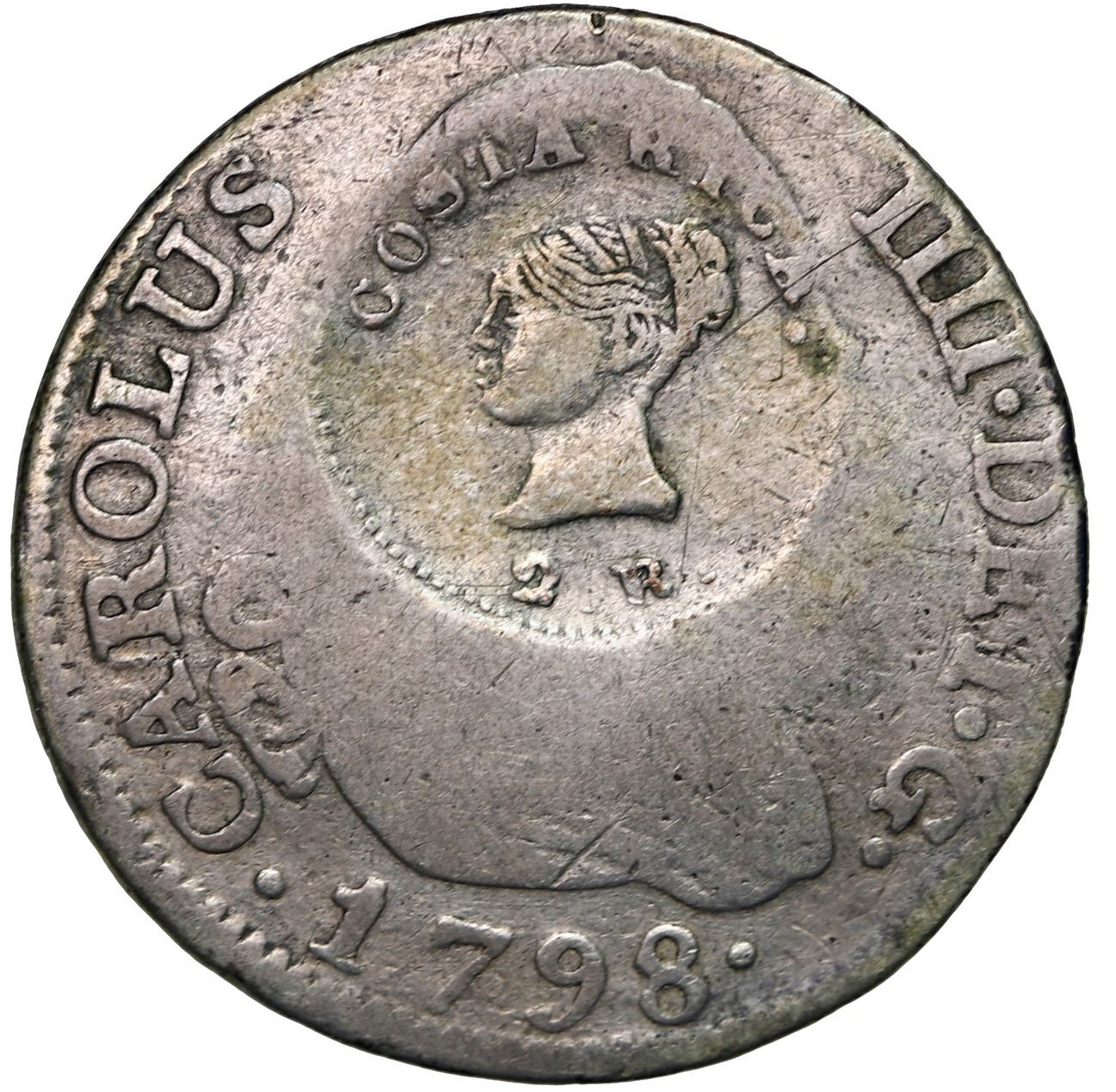 Costa Rica, 2 reales, female head / ceiba tree counterstamp (Type III, 1845) on a Madrid, Spain, bust 2 reales, Charles IV, 1798 MF, NGC G 4, c/s VF strong. KM-37. Choice full counterstamp (all details clear) on a lightly toned host with partially weak rims due to centering issues.