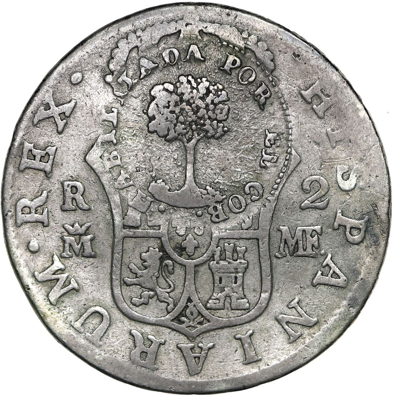 Costa Rica, 2 reales, female head / ceiba tree counterstamp (Type III, 1845) on a Madrid, Spain, bus